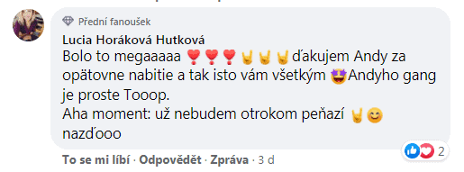 z bývalej práce. Už som nevládal a chcel som znova vycestovať do zahraničia za prácou. Po tréningu som dostal novú energiu do života. Teraz, vždy, keď mi prídu do života negatívne veci, tak už ich omnoho rýchlejšie prekonám. Predtým mi to trvalo aj mesiac dva. Teraz je to 1, maximálne 2 dni